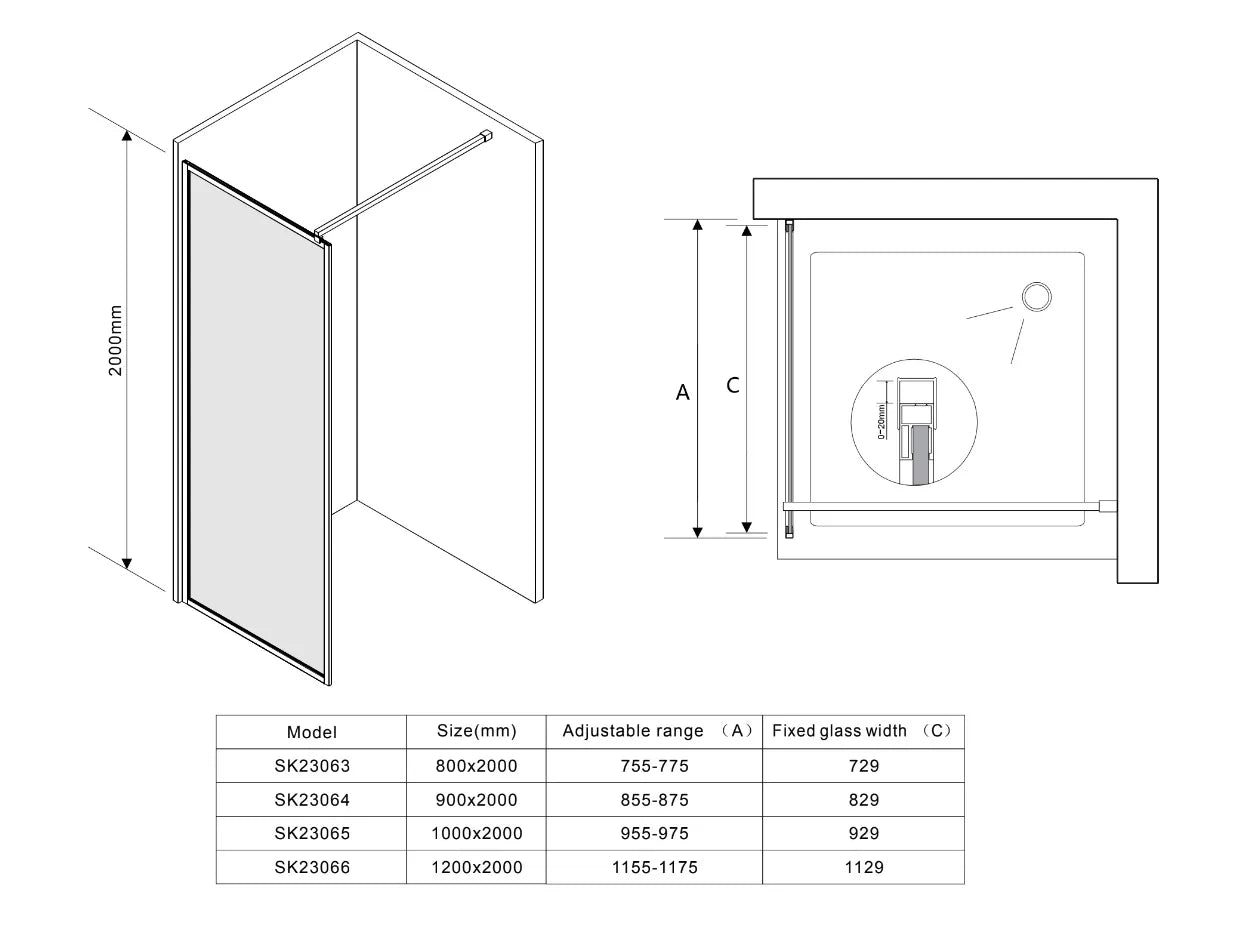 De douchewand is uitgerust met een stevig muurprofiel waarin de glasplaat wordt geschoven. Hierdoor ontstaat een verstelbaarheid van 75,5 tot 77,5 cm, waardoor de wand perfect aansluit — zelfs op vloeren met afschot. De inloopdouche kan direct op de tegelvloer worden geplaatst of op een douchebak, afhankelijk van jouw situatie.